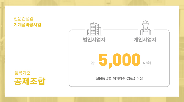 기계설비공사업 면허 등록을 위해서는 법인, 개인사업자 모두 공제조합에 약 5천만원을 예치해야 합니다.