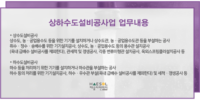 상하수도설비공사업 면허 취득과 관련하여 더 자세한 안내나 도움이 필요하실때는 건설면허 전문가 해솔씨앤아이로 문의주세요.