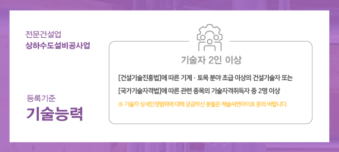 기술자는 한국건설기술인협회에서 발급하는 기계,토목 분야 초급 이상의 경력수첩을 소지하신 분들 또는 국가기술자격법에 따르는 관련 종목의 기술자격을 취득한 분들로서 준비되어야 하는데, 1인 1자격사항만 인정되므로 최소 인력의 수로서 2인 이상이 구성될 수 있도록 준비 해 주셔야 합니다.