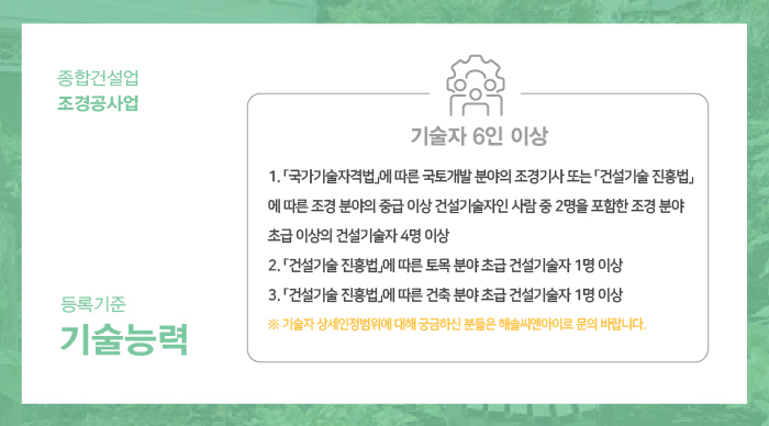 기술자는 국가기술자격법에 따른 국토개발분야의 조경기사 또는 한국건설기술인협회에서 발급하는 조경분야 중급 이상의 경력수첩보유자 중 2인을 포함한 조경분야 초급 이상의 경력수첩 보유자 4인 이상과 토목분야 초급 이상의 경력수첩 보유자 1인, 건축분야 초급 이상의 경력수첩 보유자 1인 이상으로 총 6인이 구성되어야 합니다.