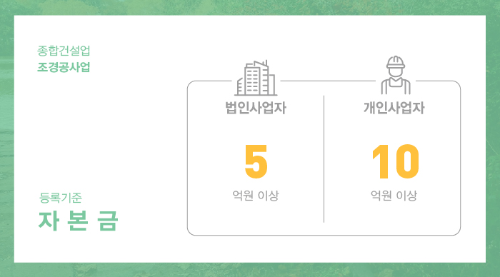 조경공사업 면허 등록을 하기 위해서는 자본금 법인 5억 이상, 개인사업자 10억 이상이 준비되어야 합니다.