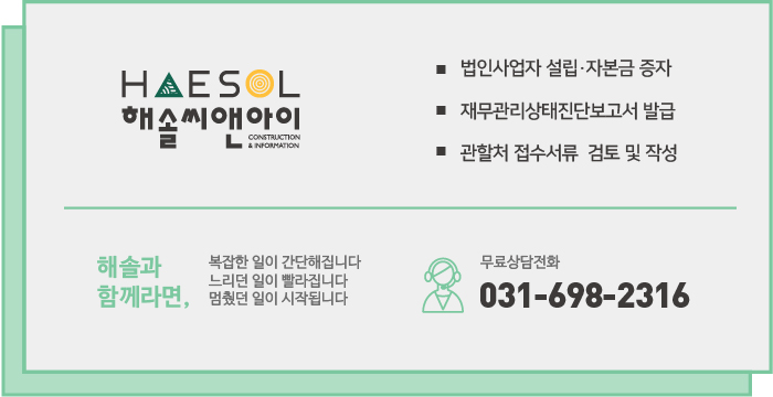 이후로는 실질자본금 보유를 입증할 수 있는 증빙서류로써 자본금 적격판정을 받은 기업진단보고서의 발급이 필요한데, 이는 회사의 재무제표를 바탕으로 세무사, 회계사, 경영지도사의 기업진단을 통해 발급 가능하며 해솔씨앤아이에서도 재무제표 검토 및 기업진단보고서 발급을 함께 진행하고 있습니다.