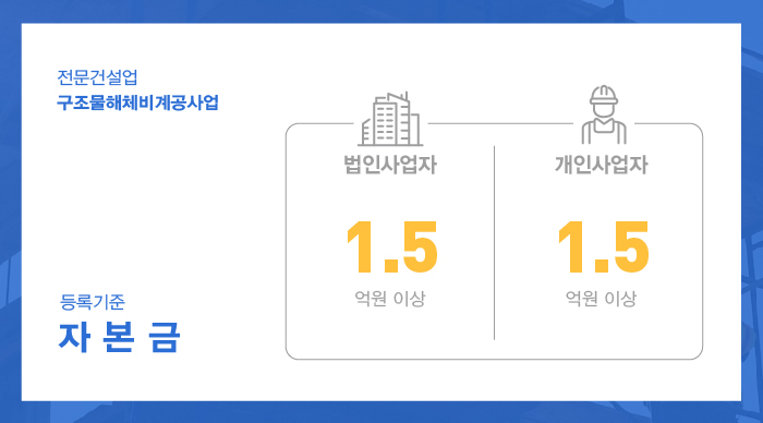 구조물해체비계공사업은 법인 및 개인사업자 모두 약 5,000만원의 금액을 출자금으로서 공제조합에 예치 진행을 해 주셔야 합니다.