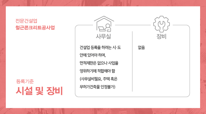 철근콘크리트공사업 면허 등록을 위해 준비되는 사무실의 경우 건축물의 용도가 사무실(업무시설) 및 근린생활시설로 명시되어 건설업 등록을 하는데 있어 건축법 등 관계법령에 위반되지 않는 시설로서의 준비가 이루어져야 합니다.