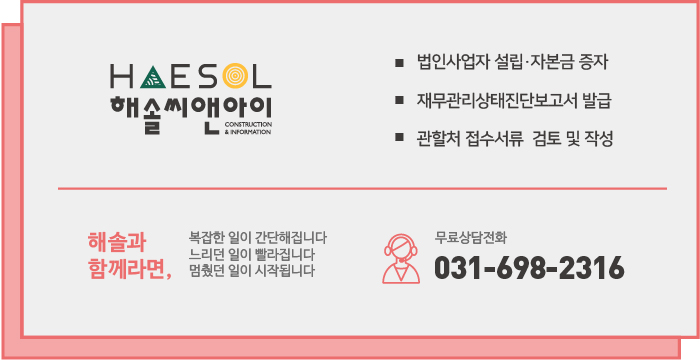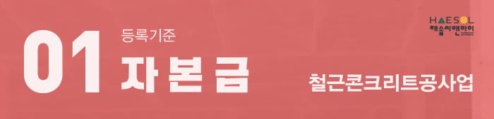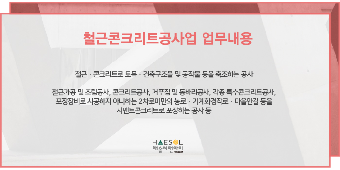 철근콘크리트공사업 면허 등록을 위한 법인사업자 설립부터 자본금 증자, 기업진단보고서 발급, 관할처 접수서류 검토 및 작성에 이르기까지 면허 취득의 전반적인 과정에 대한 도움이 필요하신 경우 건설면허 전문가 해솔씨앤아이로 문의주세요!