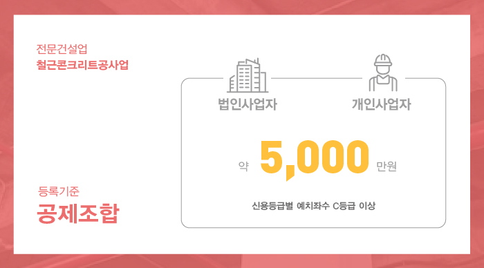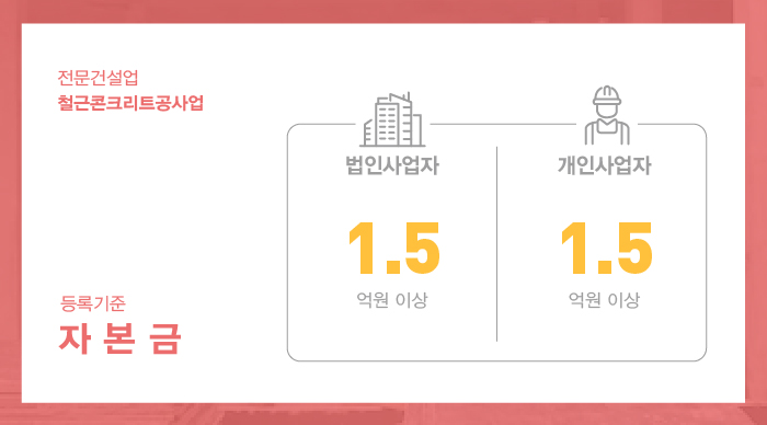 법인사업자의 경우 실질자본금과 더불어 법인등기부등본상 납입자본금 또한 등록기준 이상을 충족하도록 준비 해 주셔야 하며, 사업목적란에 철근콘크리트공사업에 관한 목적 또한 기재될 수 있어야 합니다.
