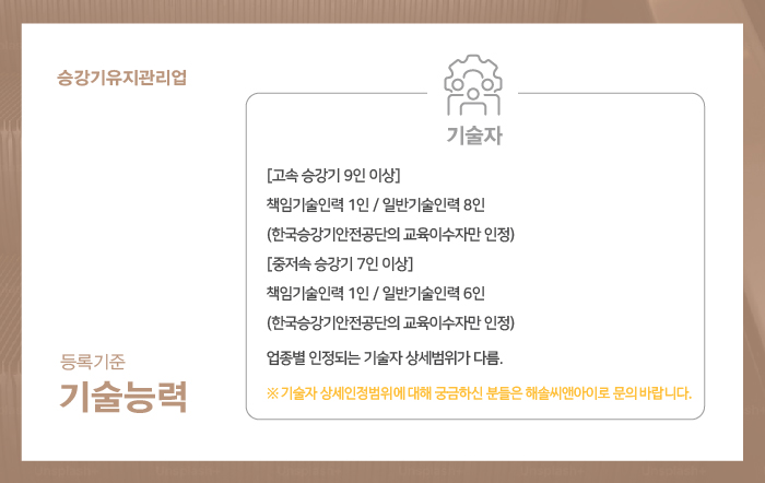 기술자는 책임기술인력과 일반기술인력으로 구분되며, 자격 요건은 회사에 상시근무가 가능한 인력으로 한국승강기안전공단 교육을 이수해야 합니다.