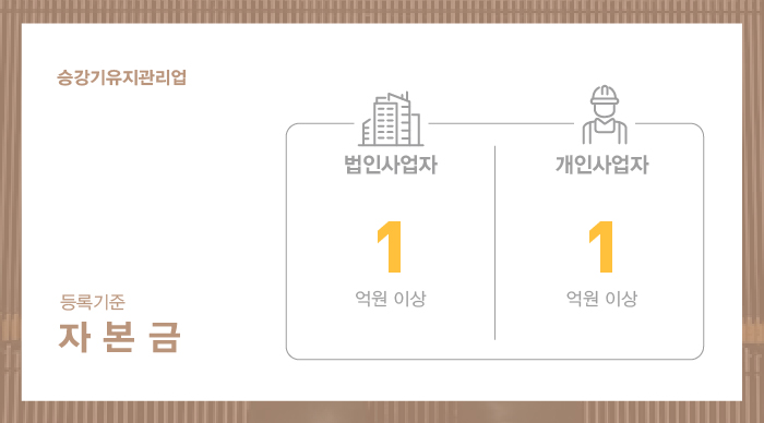 승강기유지관리업 면허 취득을 위해 충족되어야 할 자본금은 법인, 개인사업자 모두 1억원 이상으로
