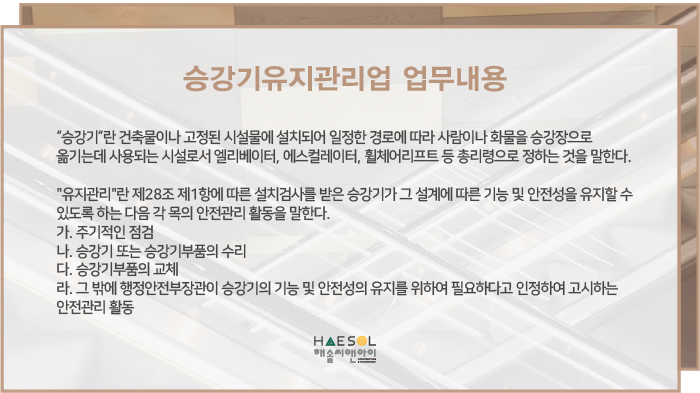 오늘은 승강기유지관리업 취득 시 준비해야 하는 필수 내용과 준비 서류에 대해 알아보는 시간을 가져보려 합니다.