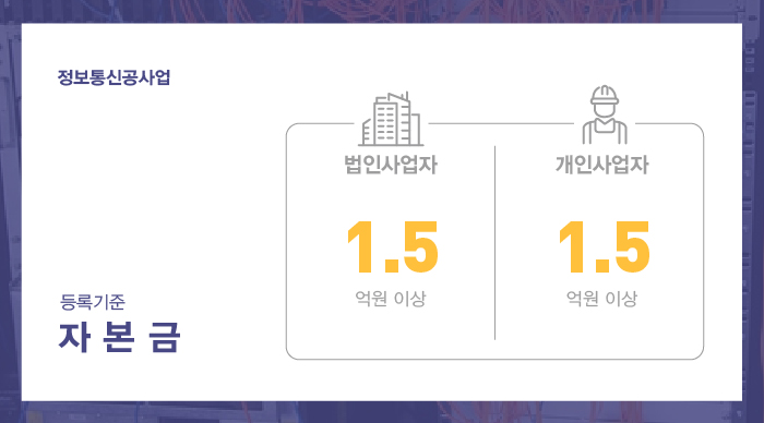 자본금 1억 5천만원 이상을 준비 해 주셔야 정보통신공사업 면허 등록을 진행할 수 있게 됩니다.