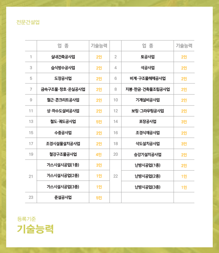 기술자는 업종 별로 필요한 최소 인원이 준비가 되어야 하고 해당 자격충족인력은 모두 회사의 상시근로자로써 근무를 해야하는 것이 원칙이기 때문에 겸업이나 겸직을 하지 않는 분들로 구성되어야 합니다.