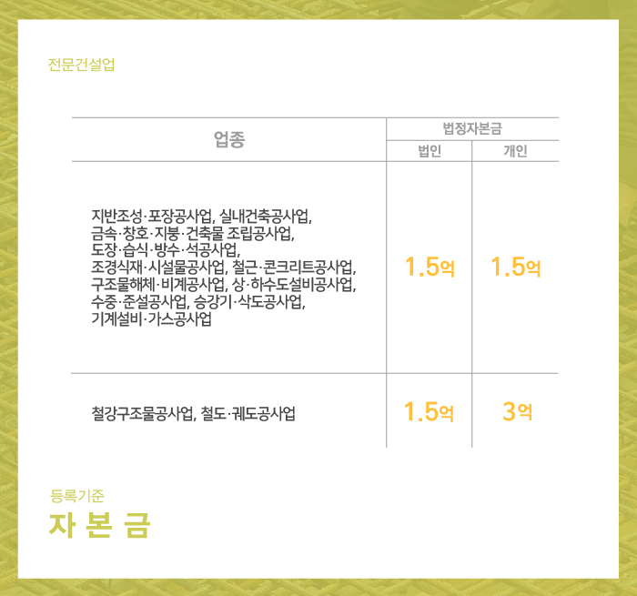 전문건설업면허 등록을 위해서는 1억 5천만원 이상의 자본금이 필요합니다.
