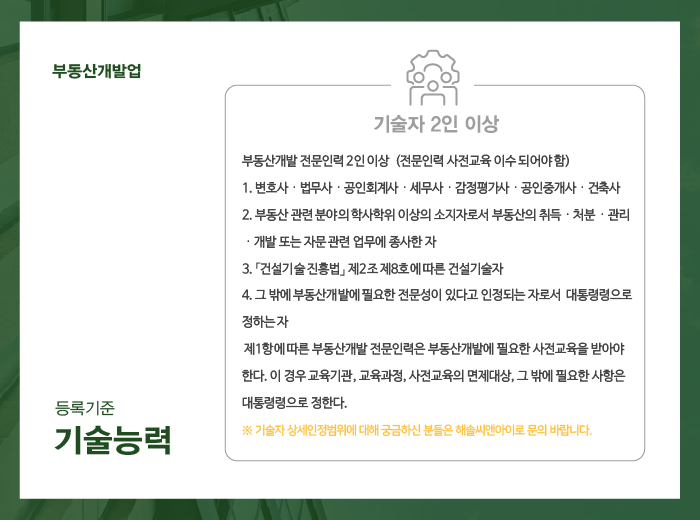 기술자가 갖추어야 할 자격 요건은, 부동산개발 전문인력 2인 이상으로 전문인력 사전교육을 이수해야 합니다.