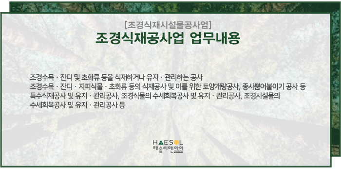 조경식재공사업은 전문건설업 중 하나 인 조경식재시설물공사업의 주력분야로서 조경수목, 잔디 및 초화류 등을 식재하거나 유지 관리하는 공사입니다.