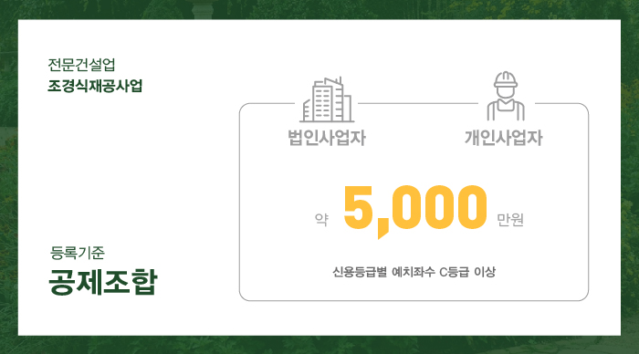 조경식재공사업 면허를 위해서는 법인, 개인사업자 모두 자본금 1.5억 이상이 필요합니다.