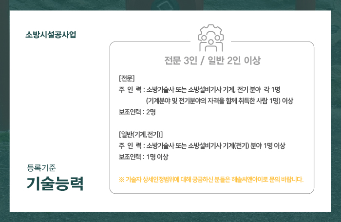 소방시설공사업은 전문분야와 일반분야에 규정되어있는 자격 요건을 갖춘 기술자를 보유해야 합니다.