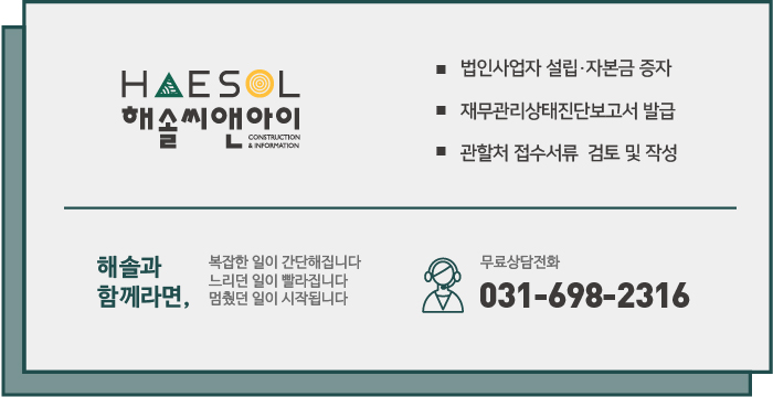 회사의 설립 시기나 형태, 겸업사업 여부, 자본금이 필요한 다른 면허의 보유 유무 등과 같이 회사가 처해진 여러 제반상황에 따라 자본금 준비 과정에 차이가 있게 되므로 해솔씨앤아이와 같은 건설경영 전문가와 함께 실질자본금에 대한 전문 지식을 바탕으로 준비하시는 것을 권장드립니다.