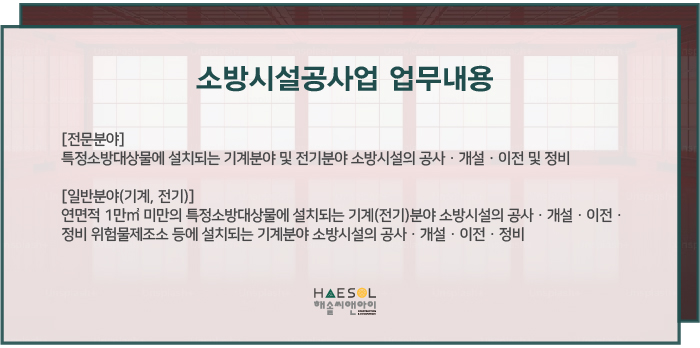 소방시설공사업은 특정 소방대상물에 설치되는 기계분야 및 전기분야의 소방시설의 공사, 개설, 이전 및 정비를 전문으로 하는 사업입니다.