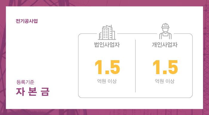 그리고 법인사업자는 법인등기부등본상 납입자본금 또한 등록기준 이상을 충족해야 하며, 사업목적란에 전기공사면허에 관한 목적이 기재되어 있어야 합니다.