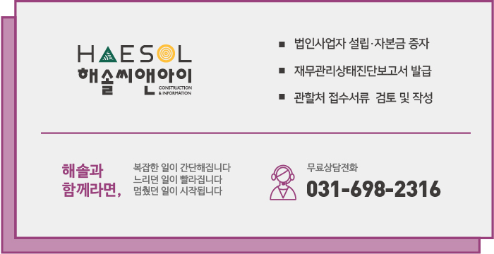 실질자본금에 대한 배경지식 없이 이를 준비하기에는 다소 까다롭게 느껴지실 수 있어 자본금 준비 과정은 해솔씨앤아이와 같은 건설면허 전문가와 함께 회사의 제반사항을 명확히 파악 후, 준비하시는 것을 권장드립니다.
