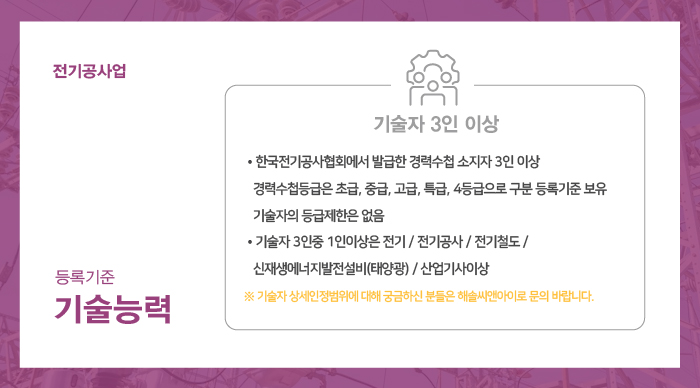 전기공사면허 기술능력 기준으로는 3인 이상의 기술자를 보유해야 합니다.