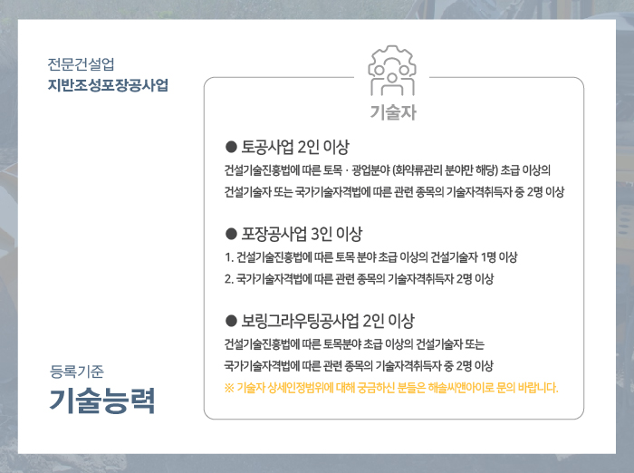지반조성포장공사업 운영을 할 수 있는 전문 기술인력이 필요합니다.