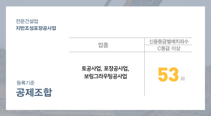 지반조성포장공사업 면허취득을 위해 법인 및 개인사업자 모두 약 5천만원의 금액을 출자금으로서 공제조합에 예치 해 주셔야 합니다.
