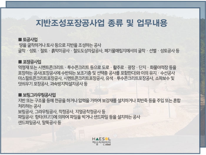 법인사업자 설립부터 자본금 증자, 기업진단보고서 발급, 관할처 접수서류 검토 및 작성에 이르기까지 지반조성포장공사업 면허 등록에 필요한 전 과정을 해솔씨앤아이와 함께 해 보세요!