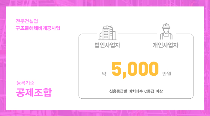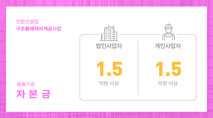 개인사업자와 법인사업자 모두 실질자본금의 준비가 필수지만, 법인사업자는 법인등기부등본상 납입자본금 또한 등록기준 이상을 충족할 수 있도록 준비해야 하며 사업목적란에 비계구조물해체공사업에 관한 목적사항을 추가해야 합니다.
