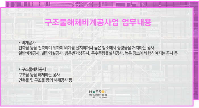 구조물해체비계공사업은 기존의 비계구조물해체공사업의 명칭이 변경된 것으로 업무 범위에는 비계공사와 구조물해체공사가 해당됩니다.