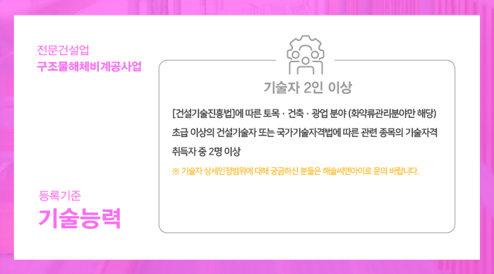 비계구조물해체공사업 실무 운영이 가능한 기술자 2인 이상이 필요합니다.