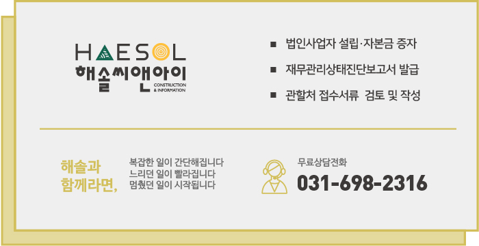 지금까지 토목공사업 면허 등록기준과 절차에 대해 안내드렸습니다. 해솔씨앤아이에서는 법인 설립부터 자본금 증자, 기업진단보고서 발급, 관할처 접수서류 검토 및 작성까지 면허 등록과 관련한 모든 업무를 진행하고 있으니, 이에 대해 궁금한 사항이 있거나 도움이 필요하실 경우 언제든지 문의주시기 바랍니다.