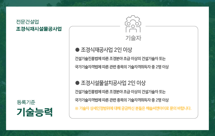 기술자는 한국건설기술인협회에서 발급하는 조경분야 초급 이상의 경력수첩 소지자 또는 국가기술자격법에 따른 관련 종목의 기술자격 취득자로서 구성될 수 있도록 해 주셔야 합니다.