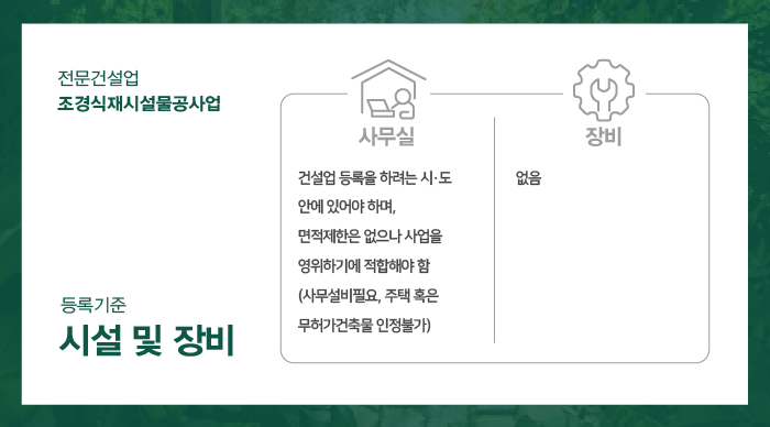 조경식재시설물공사업 면허 등록 및 사업운영을 하기 적절한 사무공간의 준비가 필요합니다.