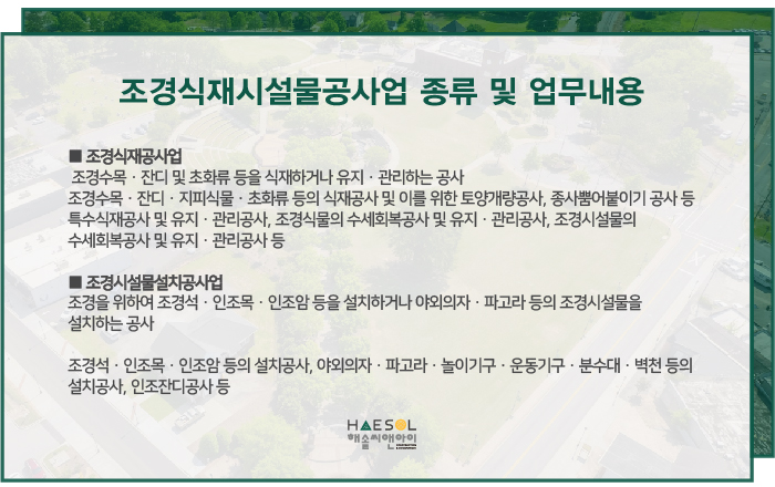 조경식재시설물공사업 면허 등록을 위한 법인사업자 설립부터 자본금 증자, 기업진단보고서 발급과 관할처 접수서류 검토 및 작성에 이르기까지 면허 취득에 대한 도움이 필요하신 경우 건설면허 전문가 해솔씨앤아이로 문의주시기 바랍니다.