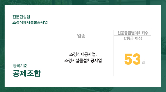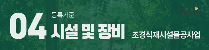 주력분야로는 조경식재공사업 또는 조경시설물설치공사업 중 한가지 혹은 두가지 업종 모두 선택하여 등록이 가능합니다.