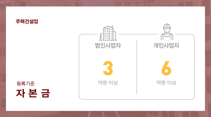 주택건설사업 등록 시 법인 3억원 이상, 개인사업자는 6억원 이상의 자본금이 준비해야 합니다.