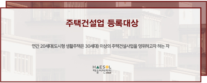 주택건설사업 등록 대상은 연간 20세대 (도시형 생활주택은 30세대) 이상의 주택건설사업을 영위하고자 하는 자로서, 분양대행업 영위 시에도 필요한 면허입니다.