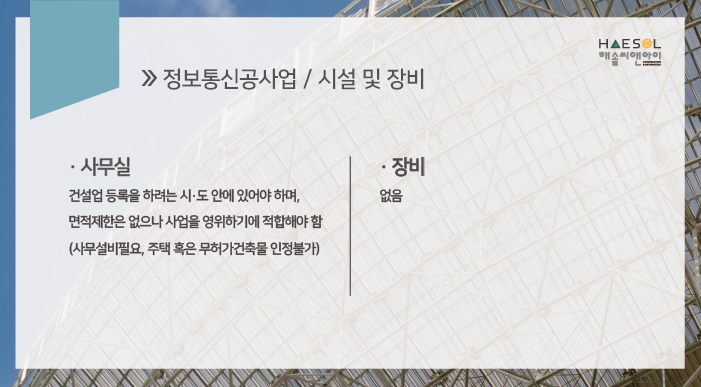이번 시간에 준비한 건설업 정보는 정보통신면허 등록을 위한 준비사항입니다.