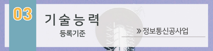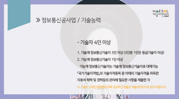 기술계 정보통신기술자 3인 이상(3인중 1인은 중급기술자 이상), 기능계 정보통신기술자 1인 이상