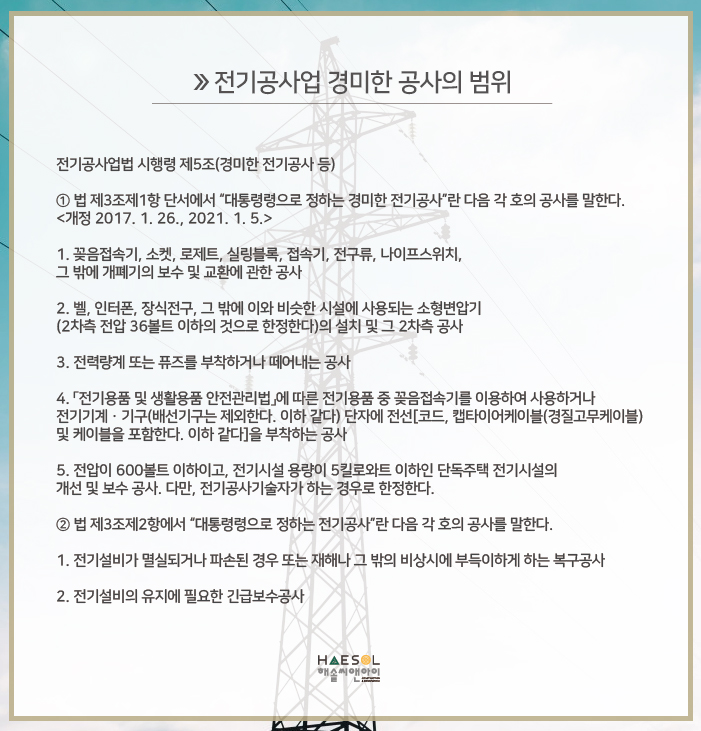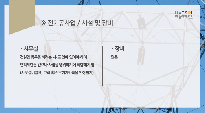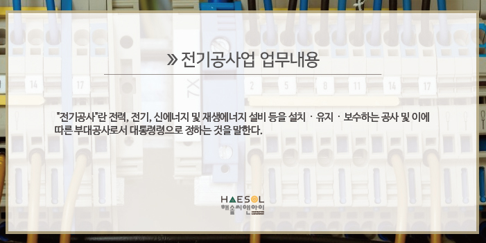오늘 건설업 경영 전문 컨설턴트 해솔씨앤아이와 함께 알아 볼 건설업 정보는 전기공사업 입니다.