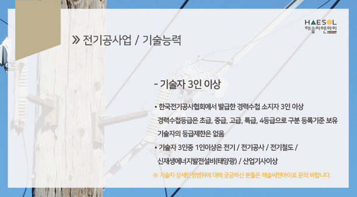 기술자 3인 중 1인 이상은 전기, 전기공사, 전기철도, 신재생에너지발전설비(태양광) 산업기사