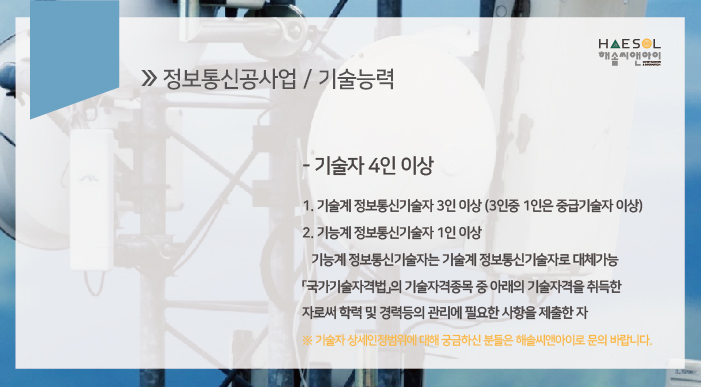 기술 자격 요건은, 기술계 정보통신기술자 3인 이상(3인 중 1인은 중급기술자 이상),