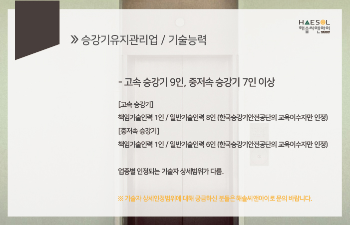 고속승강기 9인, 중저속승강기는 7인 이상의 기술자를 보유해야합니다.