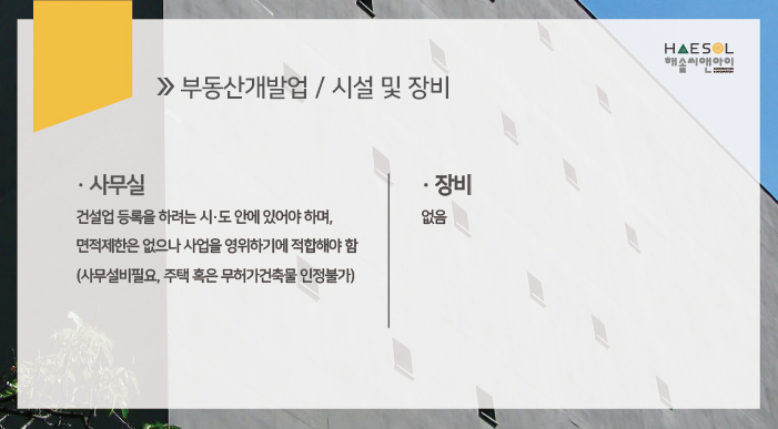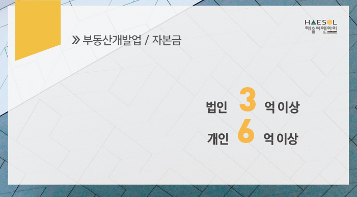그럼, 본론으로 들어가서 지금부터 부동산개발업 면허 취득을 위한 기준으로 어떠한 것을 충족해야하는지