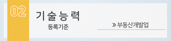 부동산개발업 기술능력 기준으로는, 최소 2인 이상의 부동산개발 전문인력을 보유해야 합니다.