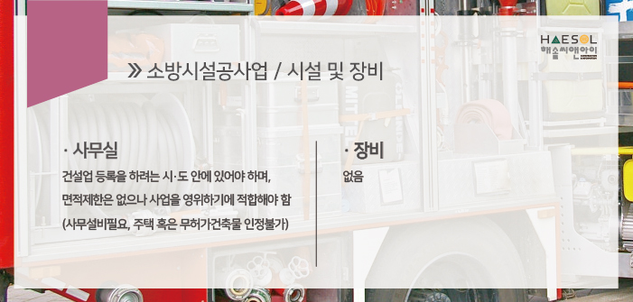 마지막 등록기준은 시설 및 장비입니다. 소방시설공사업 영위를 위함으로 사무실을 갖추는 것은