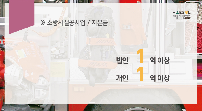 소방시설공사업은 법인 및 개인사업자 모두 자본금 1억원 이상이 충족되어야만 면허 취득이 가능합니다.