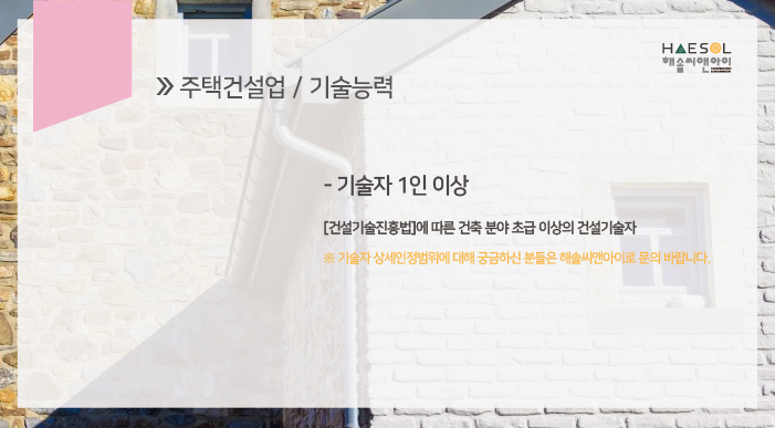 주택건설업면허 기술능력기준으로는, 1인 이상의 기술자 보유가 필요합니다.