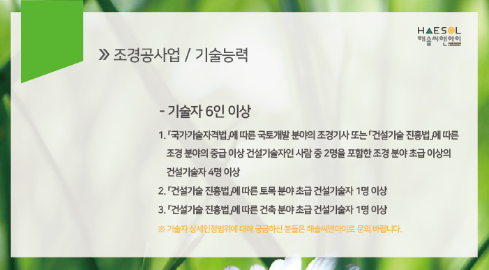 포함한 조경 분야 초급 이상의 경력수첩 보유자 4인 이상, 토목 분야 초급 이상의 경력수첩 보유자 1인 이상,